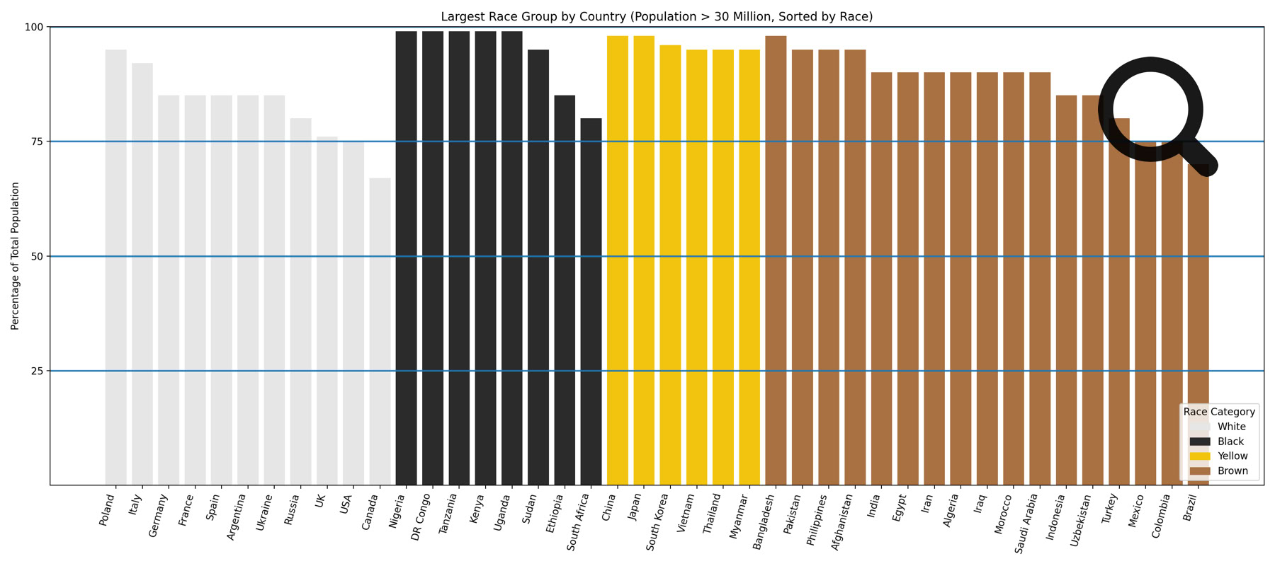 Here is a chart which shows the percentage by race in countries with more than 30 million population, about 6.8 billion people or over 80% of the world.