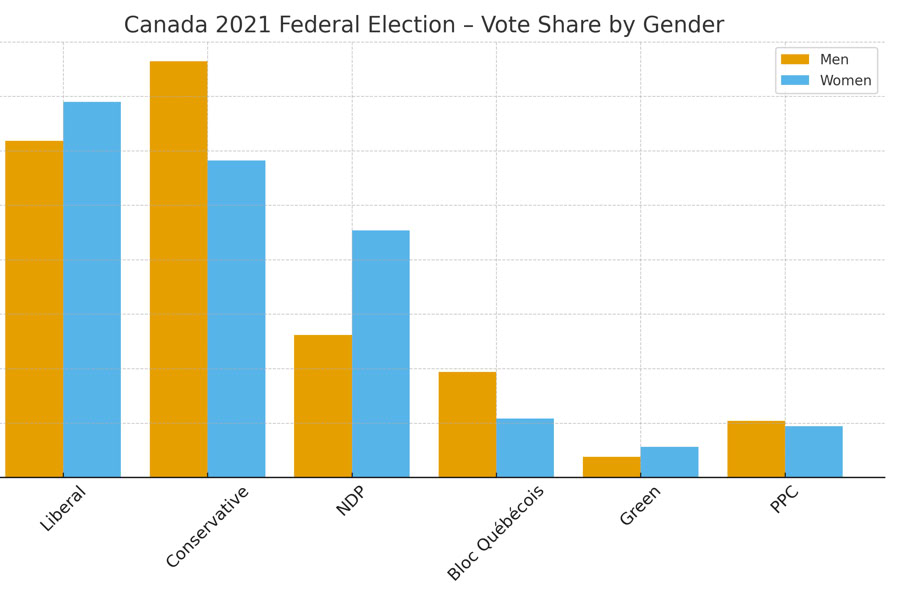 In the 2021 Canadian federal election, it seems men and women still have different voting patterns. Men’s support was mostly for right-of-centre choices, with a slight but noticeable increase for the People’s Party. Women, on the other hand, gave the centre-left parties a significant advantage, particularly the NDP’s focus on affordability and social programs.